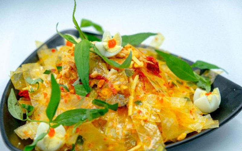 Bánh tráng trộn đúng chất được làm từ bánh tráng trước sương cho mềm dẻo, cắt thành từng sợi nhỏ rồi trộn cùng với xoài xanh bào sợi, rau răm cắt nhuyễn, móng thêm chút muối tôm Tây Ninh và vắt thêm nước chanh hoặc tắc vào.