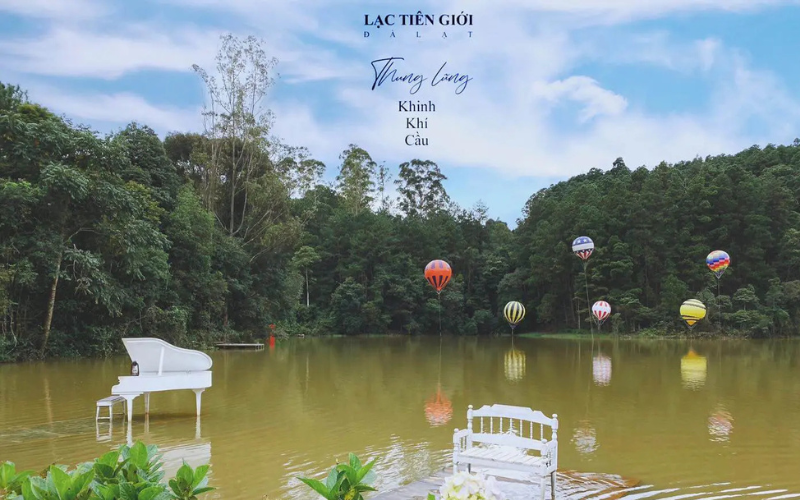 Lạc Tiên Giới có khá nhiều địa điểm để bạn có thể thoải mái sống ảo. Có thể kể đến chiếc đàn Piano nổi bật giữa mặt hồ. Chiếc ghế bay để người chụp sẽ như một nàng tiên đi trên mặt nước. Các mô hình khí cầu giúp khung cảnh xung quanh bổ sung thêm các thành phần diễm lệ. Ngoài ra, nơi này còn có nhiều bối cảnh khác để bạn lựa chọn.